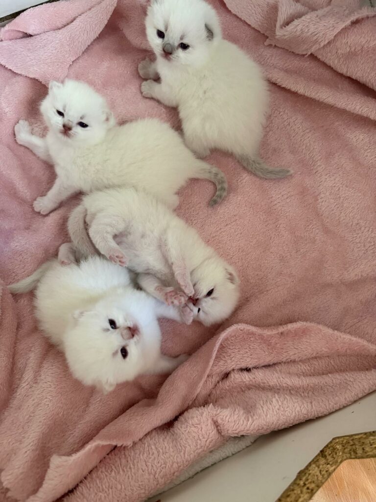 Le 3 février dernier, Umma vient de donner naissance à 4 adorables chatons color point. Ils sont encore tout jeunes et les visites pour rencontrer leurs futures familles sont sur le point de s’ouvrir.