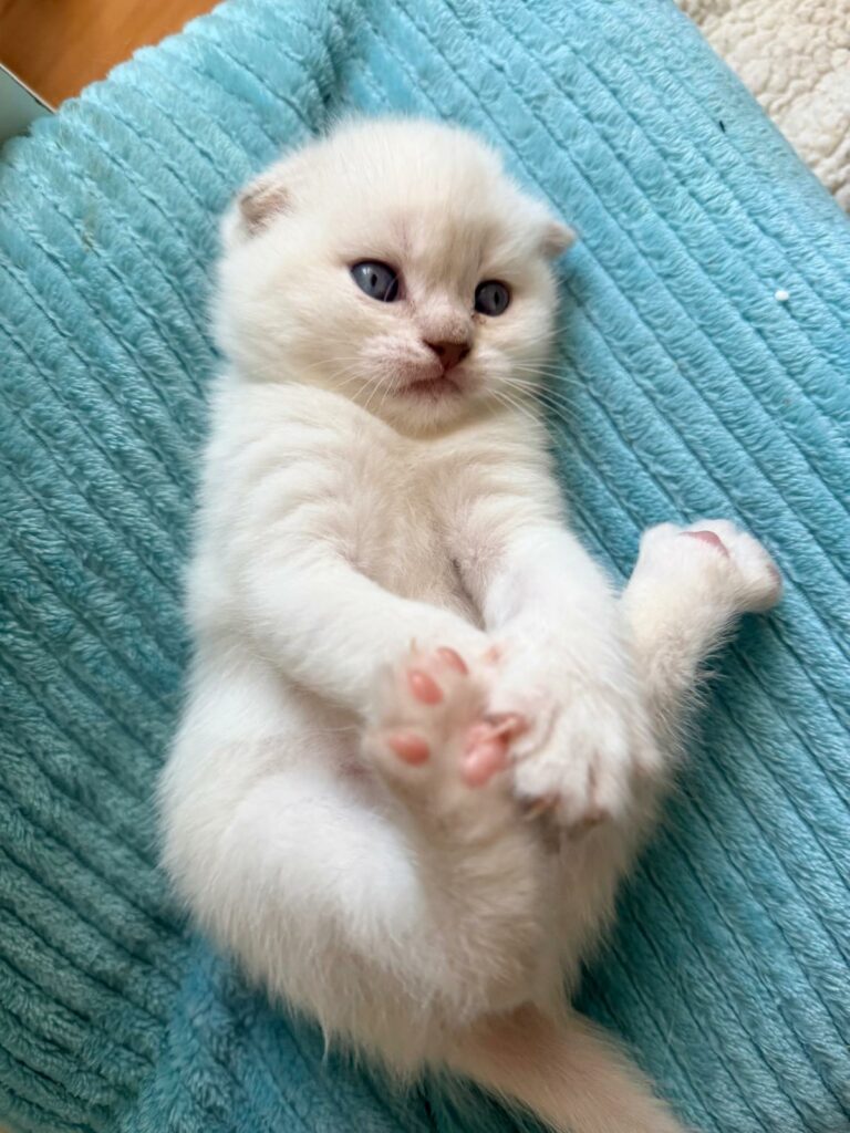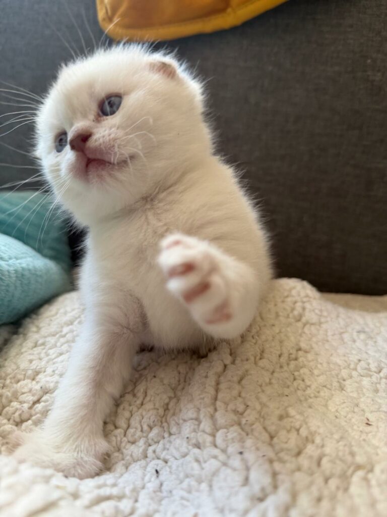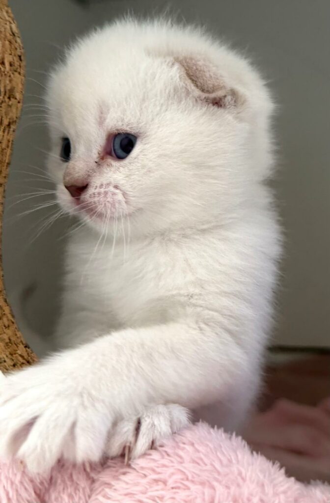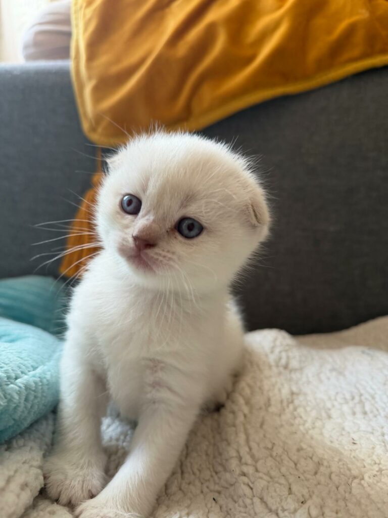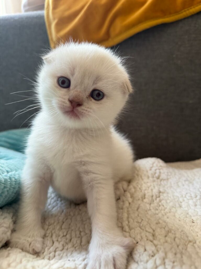 C’est un bébé chaton adorable au caractère déjà calme et un peu joueur qui est de type scottish fold chocolat point.