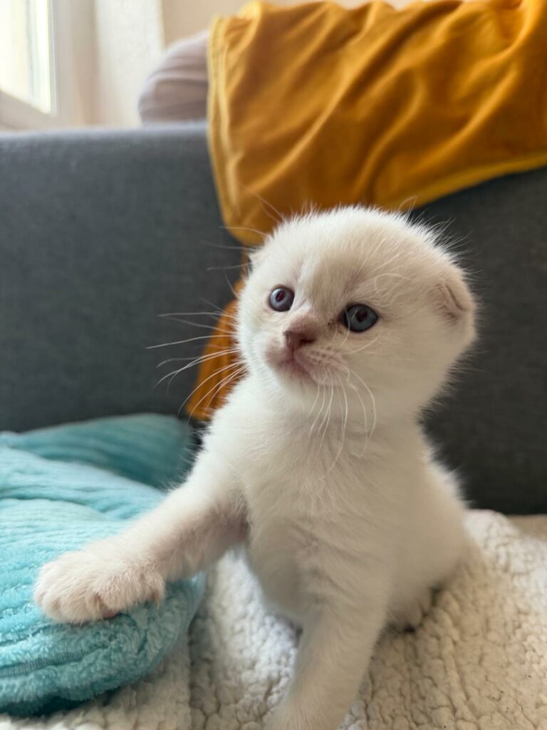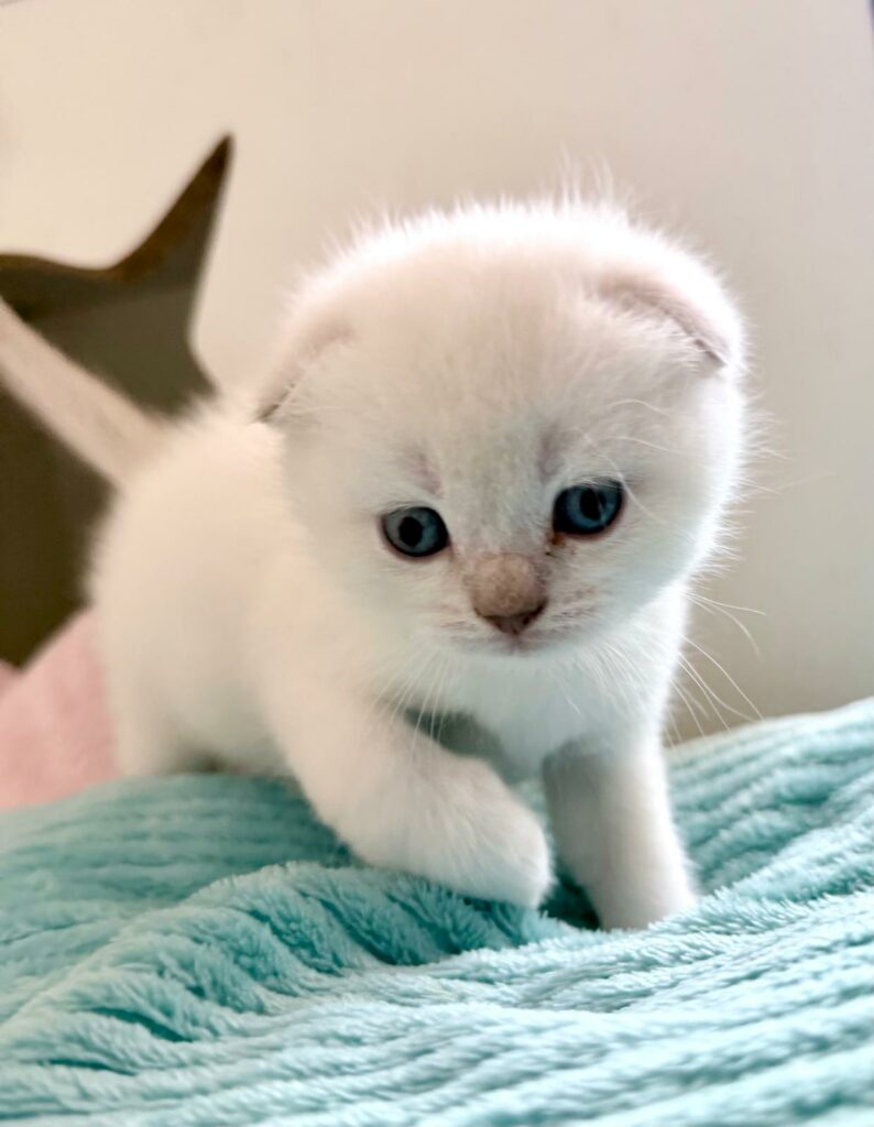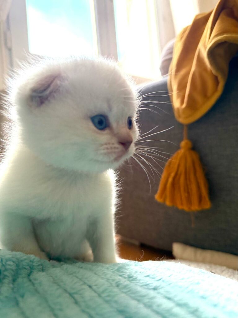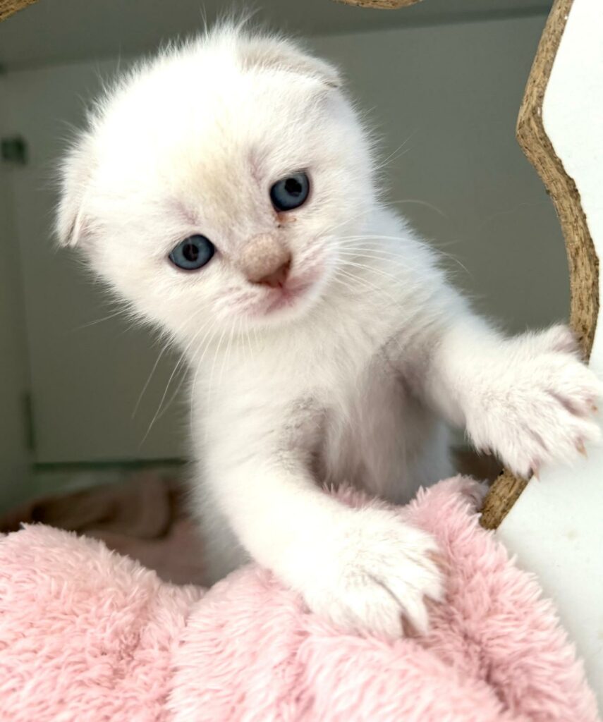 C’est un bébé chaton adorable au caractère déjà calme et un peu joueur qui est de type scottish fold chocolat point.